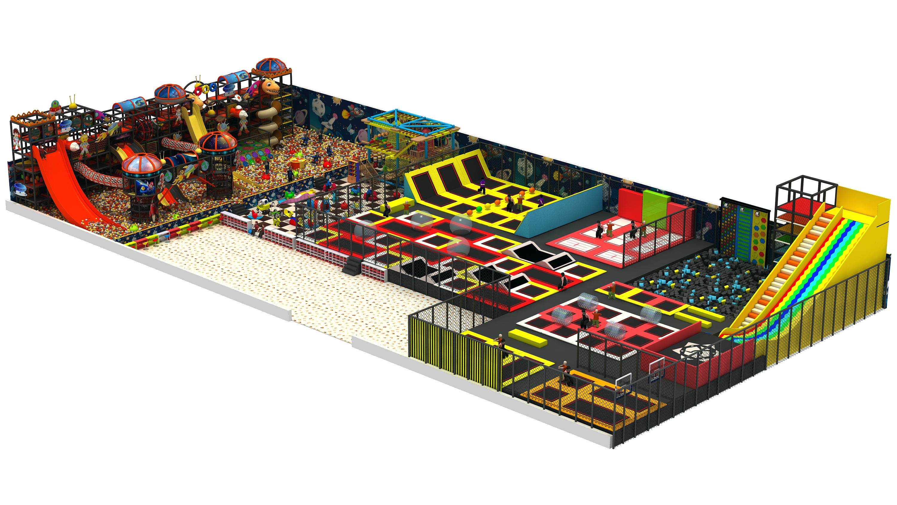 室內蹦床樂園像是(shì)一個上不封頂的籠子,支架以及護欄較為柔軟,一(yī)個相(xiàng)對密閉的空間使孩子們和大人在運動時可以免受外界的(de)影響,玩得(dé)不可開交。每個蹦床中都(dōu)有籃筐等輔助器材,讓蹦(bèng)床(chuáng)喜(xǐ)好者(zhě)們不隻局限於單純的跳躍(yuè),還能體驗飛身灌籃的感覺,提高了蹦床的多樣性和遊戲性。